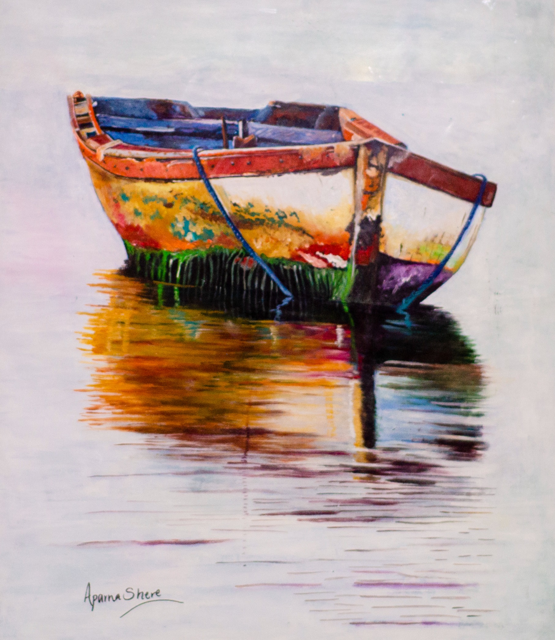 This vibrant painting by Aparna Shere depicts a colorful boat floating on calm waters, its reflection shimmering with warm hues. In Feng Shui, boats symbolize opportunities, wealth, and good fortune, especially when depicted in serene and harmonious settings like this, as they are believed to bring prosperity and success.
