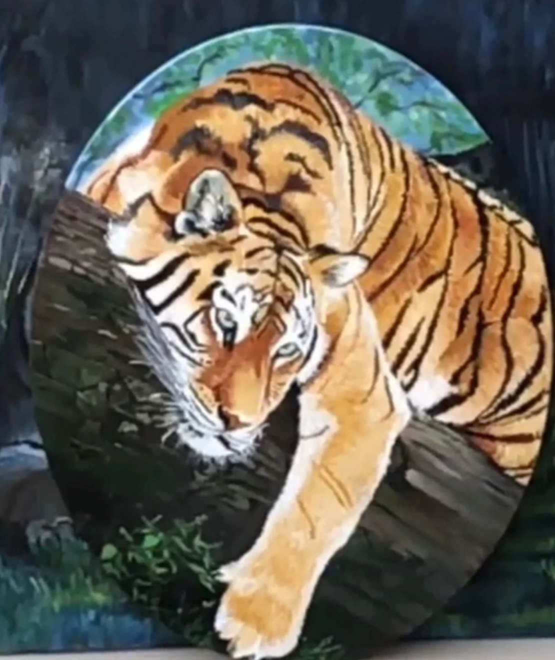 This artwork, titled “A Feline in Leisure,” captures the tiger in a moment of serene relaxation. The circular composition adds a unique dimension, emphasizing the tiger’s graceful form as it stretches languidly across a log. Its piercing gaze suggests quiet vigilance amidst its repose. The vibrant orange and black stripes contrast beautifully with the soft greens and blues of the background, creating a harmonious balance of color and tranquility. This artwork embodies the elegance and power of the tiger, even in its most restful moments.