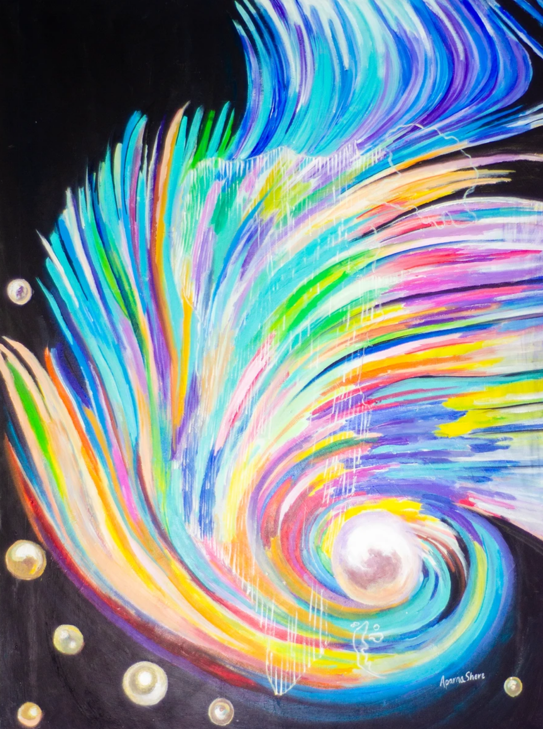 This artwork, titled “Pearl in the Swirlwind”, is a captivating representation of dynamic energy and serenity. The vibrant streaks of color spiral outward, creating a vortex that draws the eye toward a luminous pearl at the center. The surrounding orbs seem to float effortlessly, adding a celestial touch. This piece beautifully contrasts chaos and tranquility, symbolizing harmony within turbulence. Perfect for those who find beauty in vibrant abstraction and the allure of the cosmos.