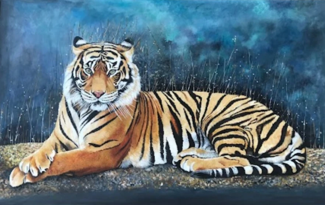 This evocative painting, titled “A Tiger’s Tale,” presents the majestic tiger in a moment of tranquil repose. The artist’s use of intricate brushwork captures the tiger’s rich, vibrant coat, showcasing its iconic stripes with lifelike precision. The backdrop of a moody, starry night adds a layer of mystique, emphasizing the tiger’s regal yet solitary nature. This artwork beautifully conveys the strength and serenity of this magnificent predator, making it a compelling tribute to one of nature’s most powerful creatures.