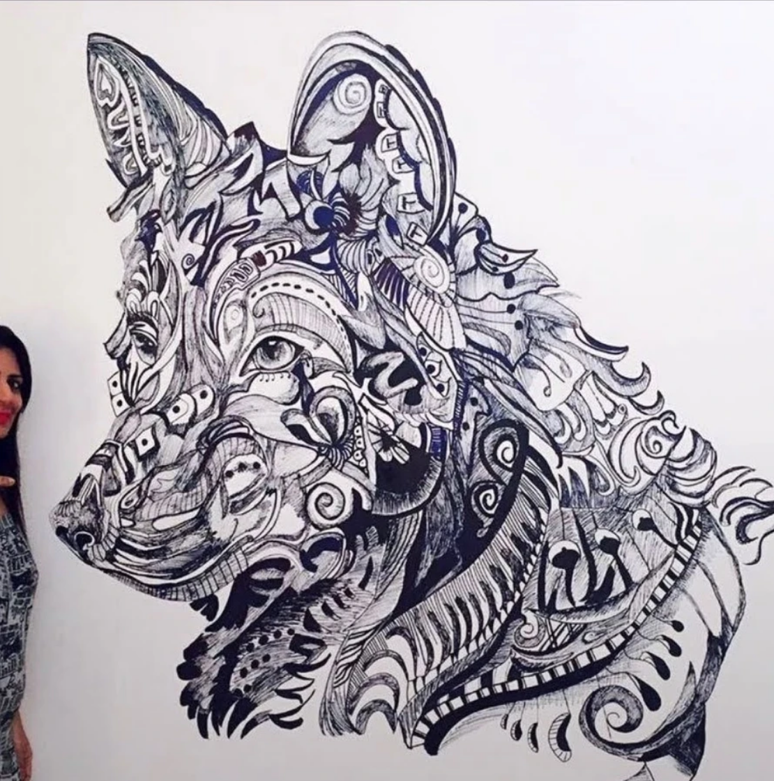 This remarkable zentangle-style wolf artwork merges bold patterns and delicate designs to create a stunning depiction of strength and complexity. The intricate details within the wolf’s silhouette capture a sense of wild energy while also showcasing the beauty of organized chaos. The patterns flow seamlessly across the face and body, offering an almost hypnotic aesthetic that invites the viewer to explore every line and curve. The presence of the artist beside this large-scale work emphasizes the skill and dedication required to bring such a piece to life. A true celebration of artistry and the spirit of the wolf!