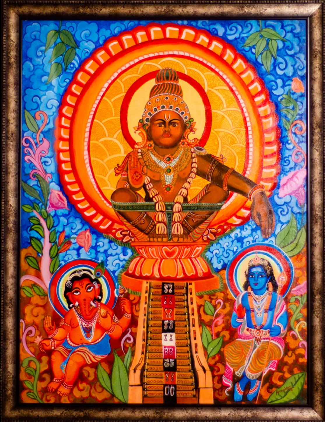 This artwork, titled “Devantakanashakarin”, masterfully captures the essence of Lord Ayyappa in a traditional Kerala mural style. Framed in intricate patterns and vibrant colors, the painting showcases Ayyappa adorned in divine regalia, symbolizing the destroyer of evil (Devantakanashakarin). The deity is flanked by two iconic figures, Lord Ganesha and Lord Krishna, adding depth and reinforcing the sacred aura of this creation.
