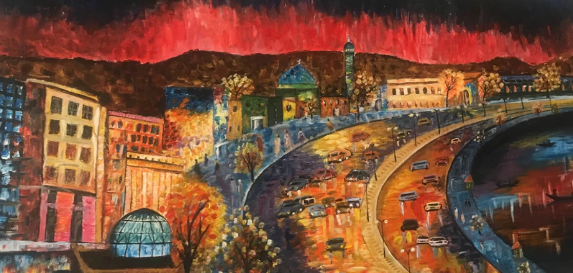 “Flaming City” captures the vibrant pulse of an urban landscape bathed in fiery hues of red and orange, evoking a sense of energy and chaos. The painting showcases a bustling city with winding roads lined with vehicles, luminous reflections on water, and historic buildings adorned with domes and intricate architecture. The dramatic red sky contrasts with the cool tones of the river, creating a vivid interplay of warmth and serenity. This dynamic piece reflects the juxtaposition of urban life’s relentless pace and moments of quiet beauty, offering a mesmerizing view of a city alive with movement and history.