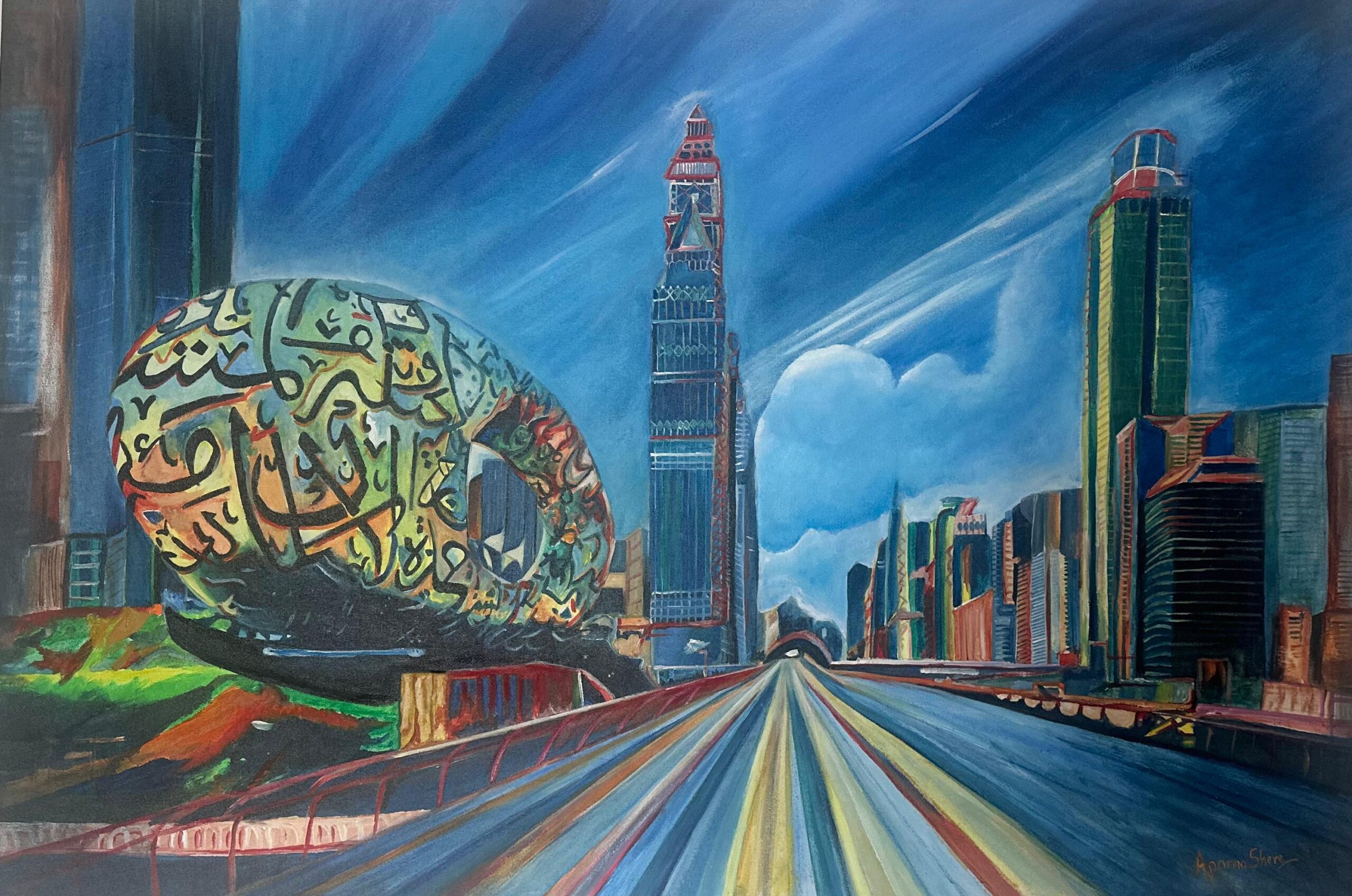 The painting titled Future Museum by Aparna Shere beautifully captures Dubai’s iconic architecture with vibrant colors and dynamic composition. The artwork highlights the Museum of the Future, a symbol of innovation, surrounded by the city’s futuristic skyline, blending creativity and realism to reflect the spirit of progress. This piece is a stunning tribute to Dubai’s vision and modern aesthetic.