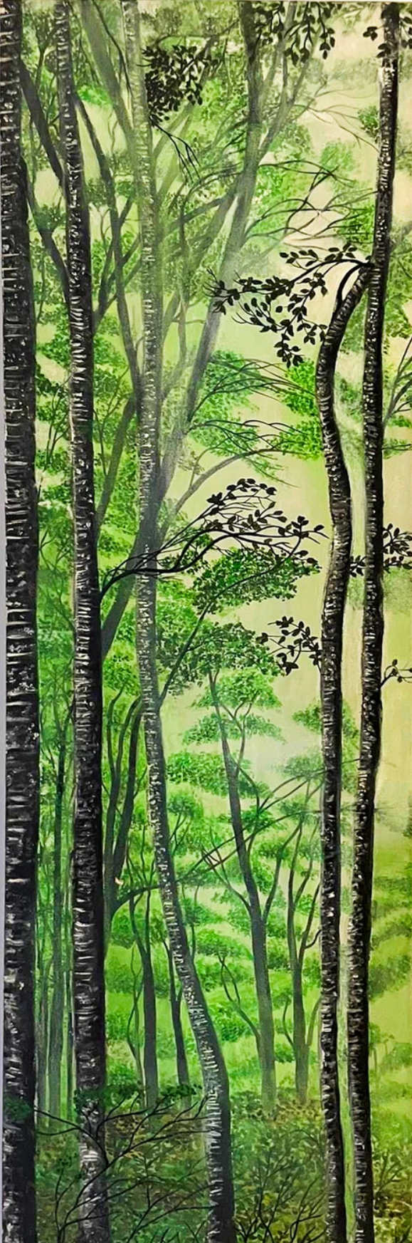 This vertical composition captures the serene beauty of a dense forest with tall, slender trees reaching upward. The soft green hues and misty atmosphere create a calming and meditative ambiance, symbolizing renewal and tranquility. The artwork evokes the soothing power of nature, inviting viewers to reconnect with its healing essence.