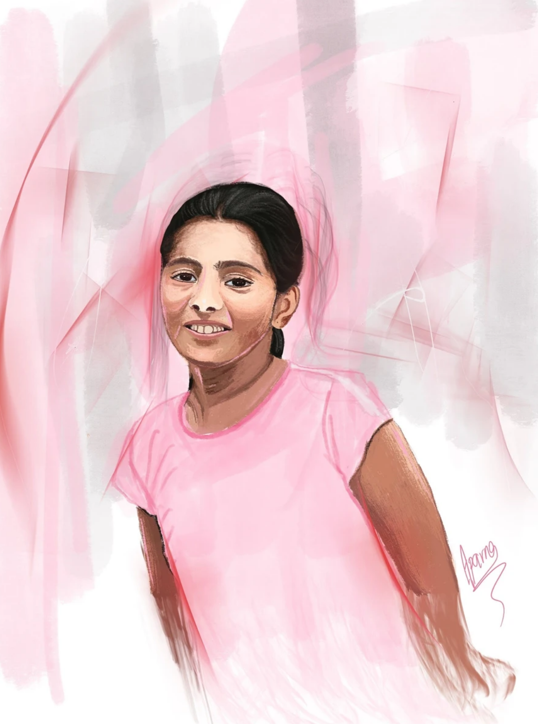 This delightful portrait radiates warmth and simplicity, as the subject’s gentle expression harmonizes beautifully with the soft pink palette. The artist has masterfully blended realism and fluid abstraction, creating a dreamy backdrop that highlights the innocence and charm of the central figure. The subtle strokes and layered textures capture both the vibrancy of youth and the serenity of the moment, making this artwork a heartwarming visual experience.