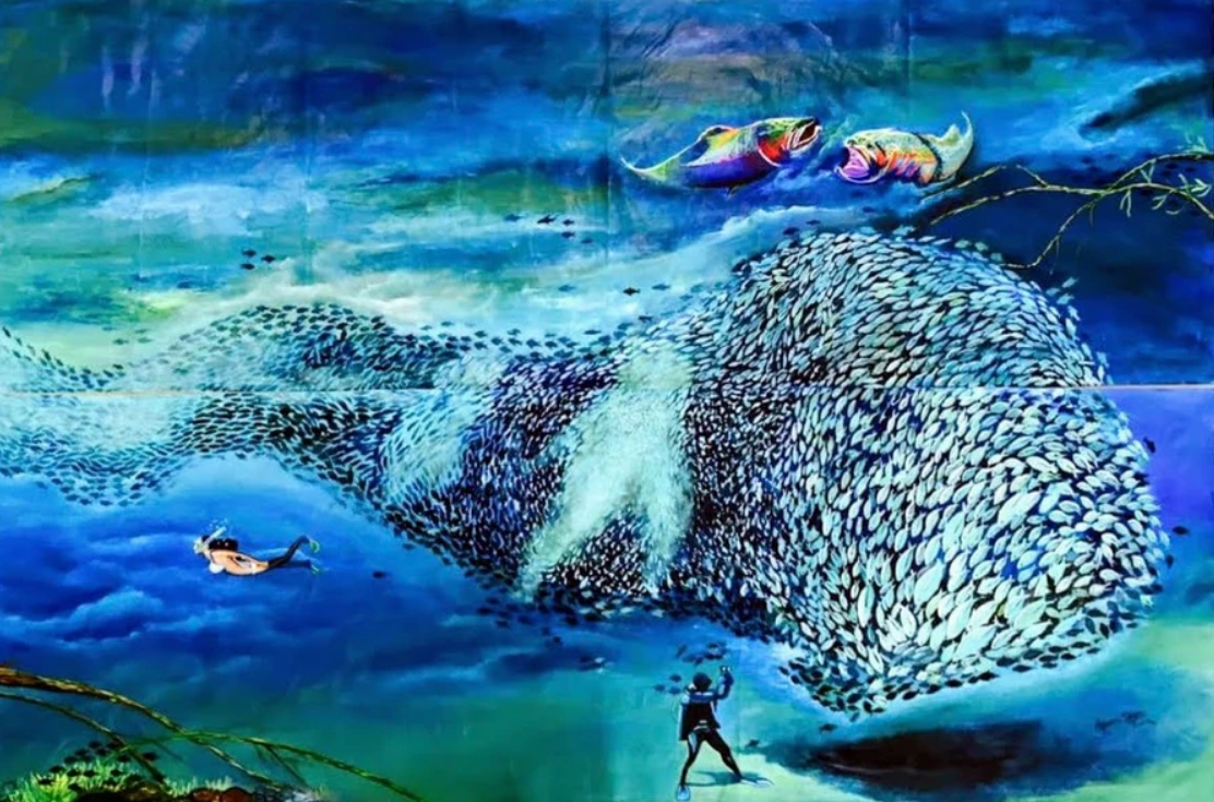 This painting, titled “Life in the Reef,” beautifully captures the vibrant underwater ecosystem of a coral reef. The centerpiece is a massive, swirling school of fish forming fluid, wave-like patterns, creating an illusion of a living, dynamic entity. Surrounding the reef, divers and marine creatures, such as colorful fish, bring the scene to life, emphasizing the symbiotic relationships in this aquatic world. The striking blues and greens evoke the serene yet energetic ambiance of the ocean, celebrating the diversity and beauty of marine life. This artwork serves as a reminder of the reef’s vitality and the importance of preserving its wonders.