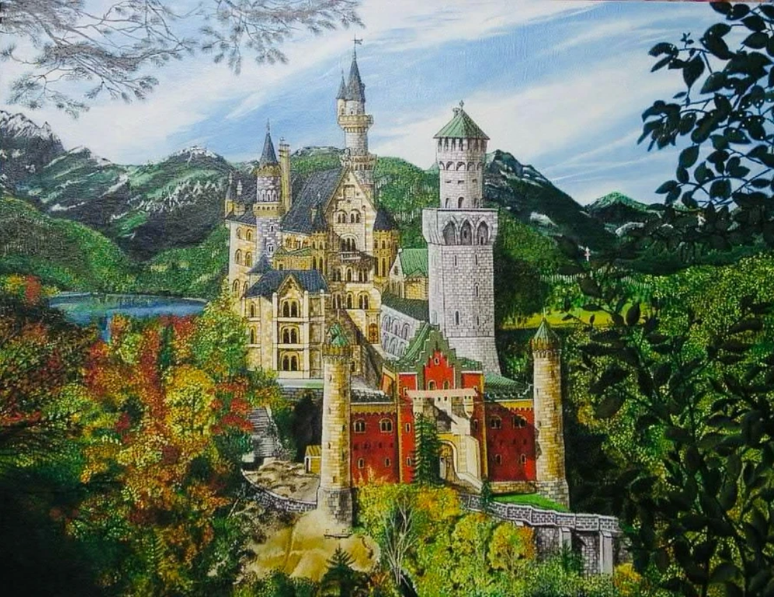 This mesmerizing painting captures the grandeur of the iconic Neuschwanstein Castle set against a backdrop of lush forests and majestic alpine peaks. The intricate detailing of the castle’s Gothic Revival architecture, paired with the vibrant hues of the surrounding autumn foliage, brings the scene to life. A testament to fairytale elegance, the composition exudes an enchanting atmosphere, inviting the viewer to immerse themselves in its timeless beauty.