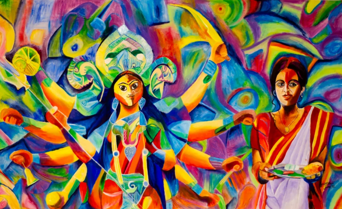 This captivating painting, titled “Shades of Durga”, radiates energy and devotion through its vibrant palette and intricate details. The artwork beautifully portrays Goddess Durga in her divine glory, surrounded by her many arms wielding symbolic tools and weapons, emphasizing power and protection. Beside her, a woman adorned in traditional attire adds a human connection, symbolizing the bridge between divinity and devotion. The swirling background in bold, dynamic colors enhances the spiritual fervor, making this piece a celebration of strength, femininity, and faith.