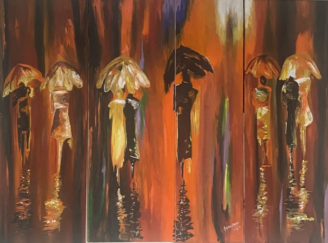 This painting, titled “Shades of Life,” presents a dynamic interplay of light, shadow, and color. The scene depicts figures walking under umbrellas, their silhouettes illuminated against a vibrant and fiery backdrop. The abstract strokes of orange, red, and brown create an impression of a rainy evening or perhaps a reflective, emotional moment. The figures, though indistinct, carry an essence of individuality, symbolizing the myriad experiences and emotions that make up life’s journey. The reflections on the wet ground further enhance the painting’s depth and atmosphere, evoking a sense of movement and continuity. This artwork beautifully captures the essence of life’s unpredictability and the shelter we seek within it.