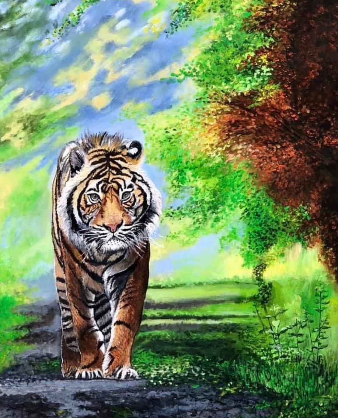 This striking artwork, titled “Silent Stalker,” depicts the tiger in its natural elegance, treading softly amidst a lush, verdant forest. The vivid greens of the surrounding foliage contrast beautifully with the tiger’s golden-orange coat, emphasizing its stealth and commanding presence. The subtle shadows and dappled sunlight add depth to the composition, creating a serene yet suspenseful ambiance. The tiger’s focused gaze and deliberate stride evoke both grace and power, embodying the essence of this magnificent predator in its tranquil yet watchful journey through the wilderness.