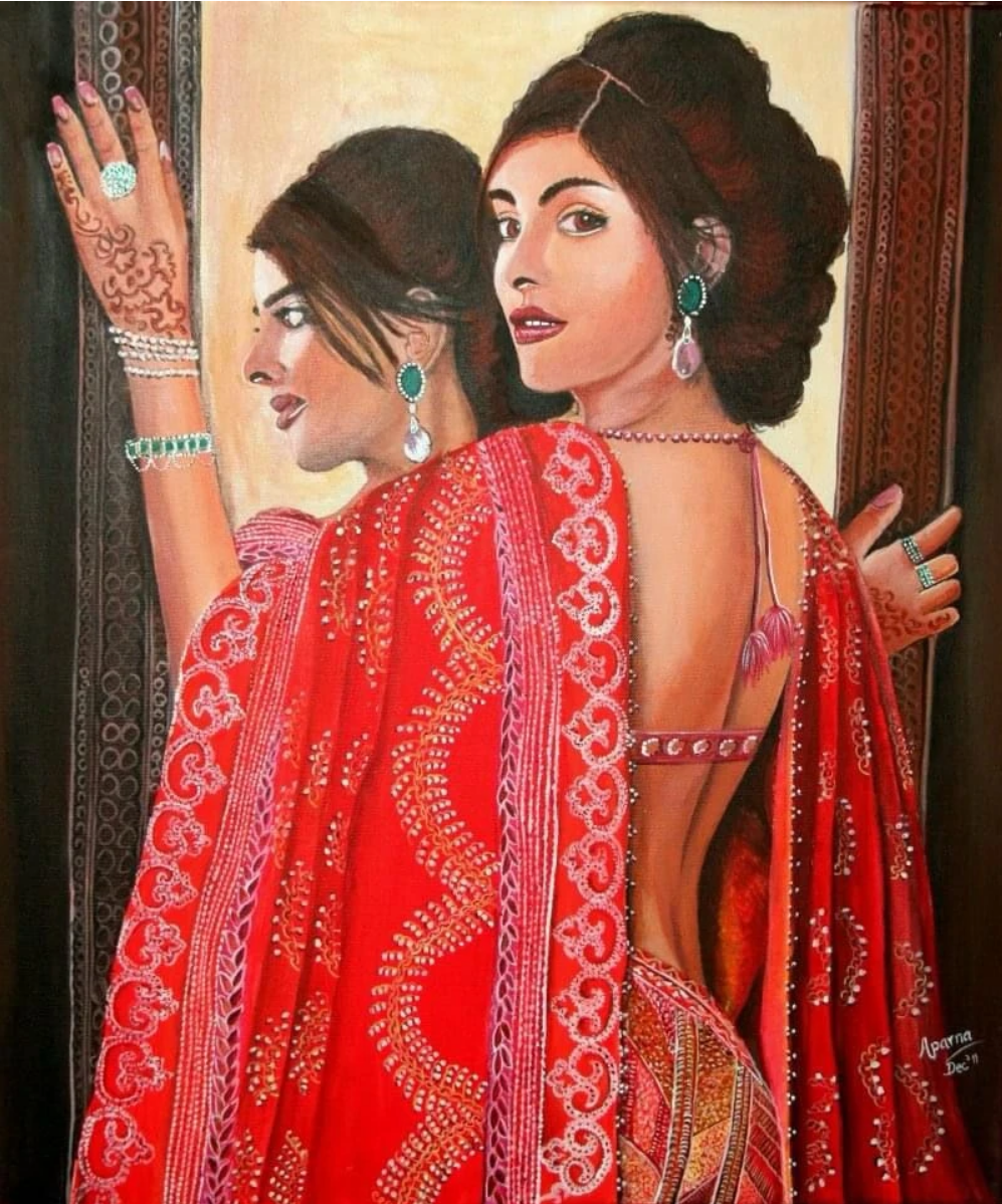 This exquisite painting captures the allure and elegance of a woman draped in a richly embroidered crimson sari, standing gracefully in front of a mirror. The intricate details of her attire, adorned with delicate patterns and sparkling embellishments, reflect the artist’s mastery in portraying traditional textiles. Her jewelry, including emerald earrings and shimmering bangles, adds a regal touch to the composition. The interplay of her reflection in the mirror and her poised demeanor evokes a sense of duality, showcasing both her outward beauty and inner grace. This artwork celebrates cultural sophistication with remarkable finesse.