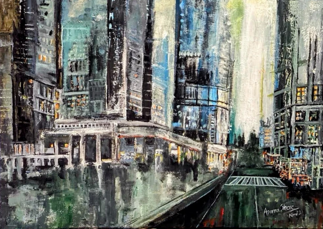 “The Shallows of the City” portrays the enigmatic and bustling life of an urban landscape through bold, textured strokes. The painting captures towering skyscrapers, their reflective glass surfaces bathed in hues of blue, grey, and white, creating a sense of depth and structure. The streets are alive with scattered lights and subtle shadows, evoking the city’s constant motion, even in its quiet moments. The muted palette contrasts with sporadic pops of warm tones from windows and streetlights, adding a dynamic interplay of light and dark. This piece masterfully illustrates the coexistence of stillness and chaos in urban life, inviting viewers to lose themselves in its reflective depths.