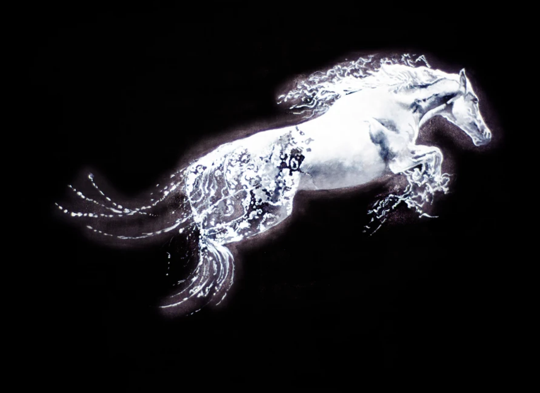 The artwork “The Stallion’s Escape” presents a luminous portrayal of a stallion leaping forward, exuding raw energy and liberation. The ethereal white of the horse glows against the stark black background, symbolizing purity and the triumph of freedom over constraints. The intricate details of water-like patterns on its body blend seamlessly into its dynamic motion, adding an otherworldly, fluid quality. This interplay of light and motion captures the essence of breaking free and charging into unbounded possibilities. A masterpiece that resonates with themes of courage, determination, and transcendence.