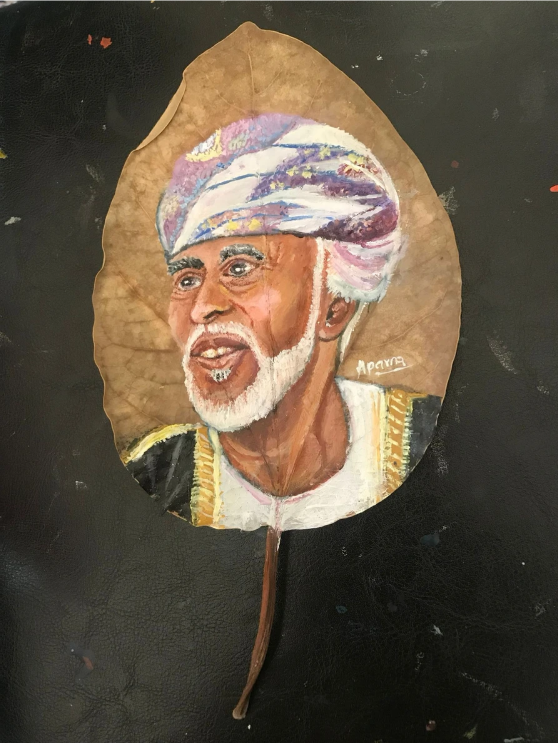 This captivating artwork of the Sultan of Oman is meticulously painted on a natural leaf, showcasing an extraordinary fusion of nature and art. The detailed portrait captures the essence of the Sultan’s regal demeanor, with expressive features and a beautifully rendered traditional Omani headdress. The use of the leaf as a canvas highlights the artist’s innovative approach, blending the earthy texture of the leaf with vibrant acrylic colors to create a striking visual harmony. This piece exemplifies artistic ingenuity, paying homage to both cultural heritage and the natural world.